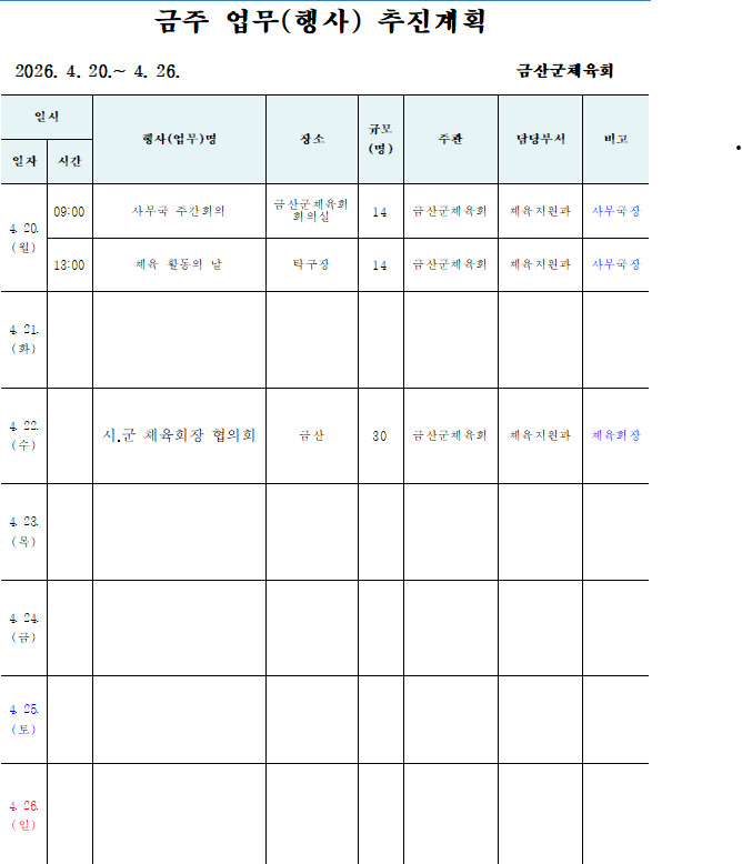 프린트 홈 정보알림 주간일정 주간일정 링크 공유 (링크 주소 복사) QR코드 sns 공유하기 여닫기 페이스북 담기 트위터 담기 네이버 블로그 담기 밴드 담기 라인 담기 이 글의 트랙백 주소를 복사하시겠습니까? 확인 2026. 4. 20.(월) ~ 4.26.(일) 작성자 : 관리자 등록일 : 2026/04/20 조회수 : 12 IP : 175.♡.♡.53 이전 글 다음 글 목록 비밀글 확인을 위해 비밀번호를 입력해주세요. 비밀번호 : 확인 QRCODE를 스캔하세요.