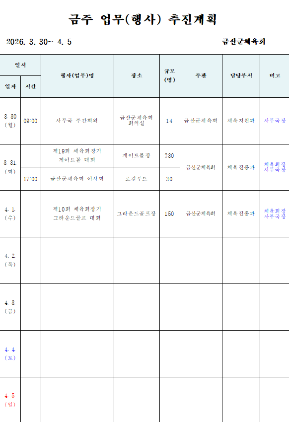 프린트 홈 정보알림 주간일정 주간일정 링크 공유 (링크 주소 복사) QR코드 sns 공유하기 여닫기 페이스북 담기 트위터 담기 네이버 블로그 담기 밴드 담기 라인 담기 이 글의 트랙백 주소를 복사하시겠습니까? 확인 2026. 3.30.(월) ~ 4. 5.(일) 작성자 : 관리자 등록일 : 2026/03/30 조회수 : 19 IP : 175.♡.♡.53 이전 글 다음 글 목록 비밀글 확인을 위해 비밀번호를 입력해주세요. 비밀번호 : 확인 QRCODE를 스캔하세요.